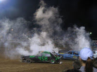 There was something different this time though...a car that was actually in good shape! I don't think there was even a scratch on it. Maybe this was just extra incentive for everyone else to gang up on him. After about 10 seconds he had his back wheel completely ripped off (first picture below). About 10 more seconds and he not only got completely rolled over, but the other car ended up pretty much running over him as well. Good stuff, good stuff indeed!